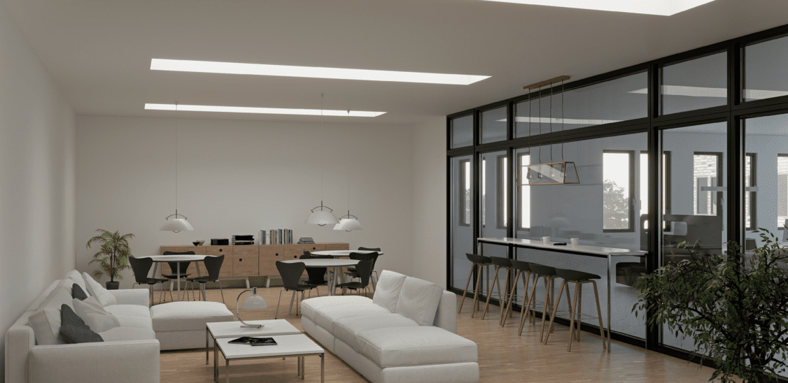 需要指出的是,该项目采用了智慧混合光源灯具。当阳光不足或完全没有阳光时,LED光源将自动开启并补足阳光缺失的部分,以保持室内照度恒定不变。
