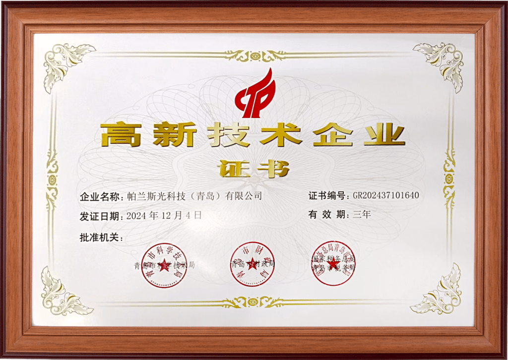 热烈祝贺 帕兰斯通过“高新技术企业”认定 近日,帕兰斯光科技(青岛)有限公司凭借卓越的研发实力与创新成果,成功